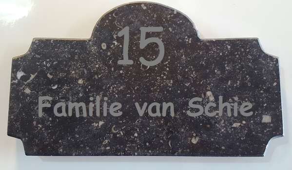 Het naambordje wordt vervaardigd uit een plaat natuursteen met een dikte van 2 cm.Voor een correcte bevestiging van het naambord zijn er bevestigingsstiften aan de achterkant aangebracht. Deze stiften worden geplaatst in reeds geboorde gaten. Door het gebruik van een degelijke montagekit zal het naambord stevig blijven zitten.
