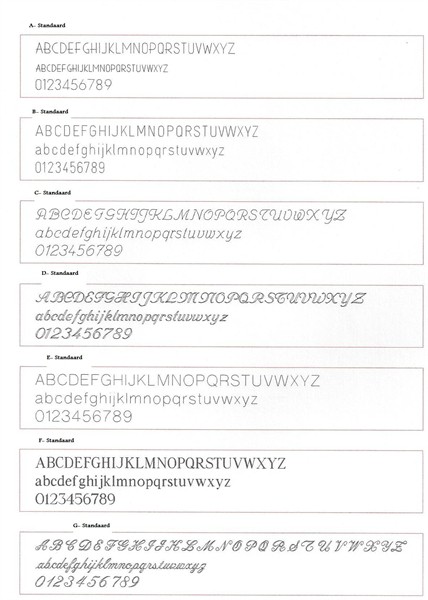 Messing naambordje wordt aan de voorzijde gegraveerd en zwart ingelakt.  De tekst wordt gecentreerd. U kunt kiezen uit verschillende lettertype ( zie onder)