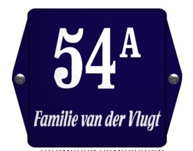 Oortjes en bord krijgen dezelfde kleur. Tekst wordt beeldvullend geproduceerd vanuit het mideden. Huisnummer is altijd sier. Verschillende kleuren en lettertype mogelijk.