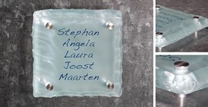 Glazen naamplaat : Bij dit glazen naambord is gebrokkeld glas gebruikt in een matte uitvoering. Hierdoor komt uw naamplaat helemaal tot zijn recht.
