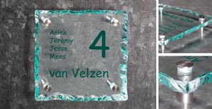 Glazen naamplaat : Bij dit glazen naambord is gebrokkeld glas gebruikt in een doorzichtige uitvoering. Hierdoor komt uw naamplaat helemaal tot zijn recht.