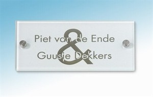 In deze serie naamborden maken we gebruik van 6 mm dik spiegelglas. De met de computer gemaakte mal wordt op de spiegel aangebracht en d.m.v. zandstralen wordt de overtollige spiegellaag weg gestraald zodat alleen de tekst overblijft.