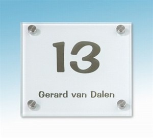 Serie glazen naambordjes maken we gebruik van 6 mm dik spiegelglas. De met de computer gemaakte mal wordt op de spiegel aangebracht en d.m.v. zandstralen wordt de overtollige spiegellaag weg gestraald zodat alleen de tekst overblijft.